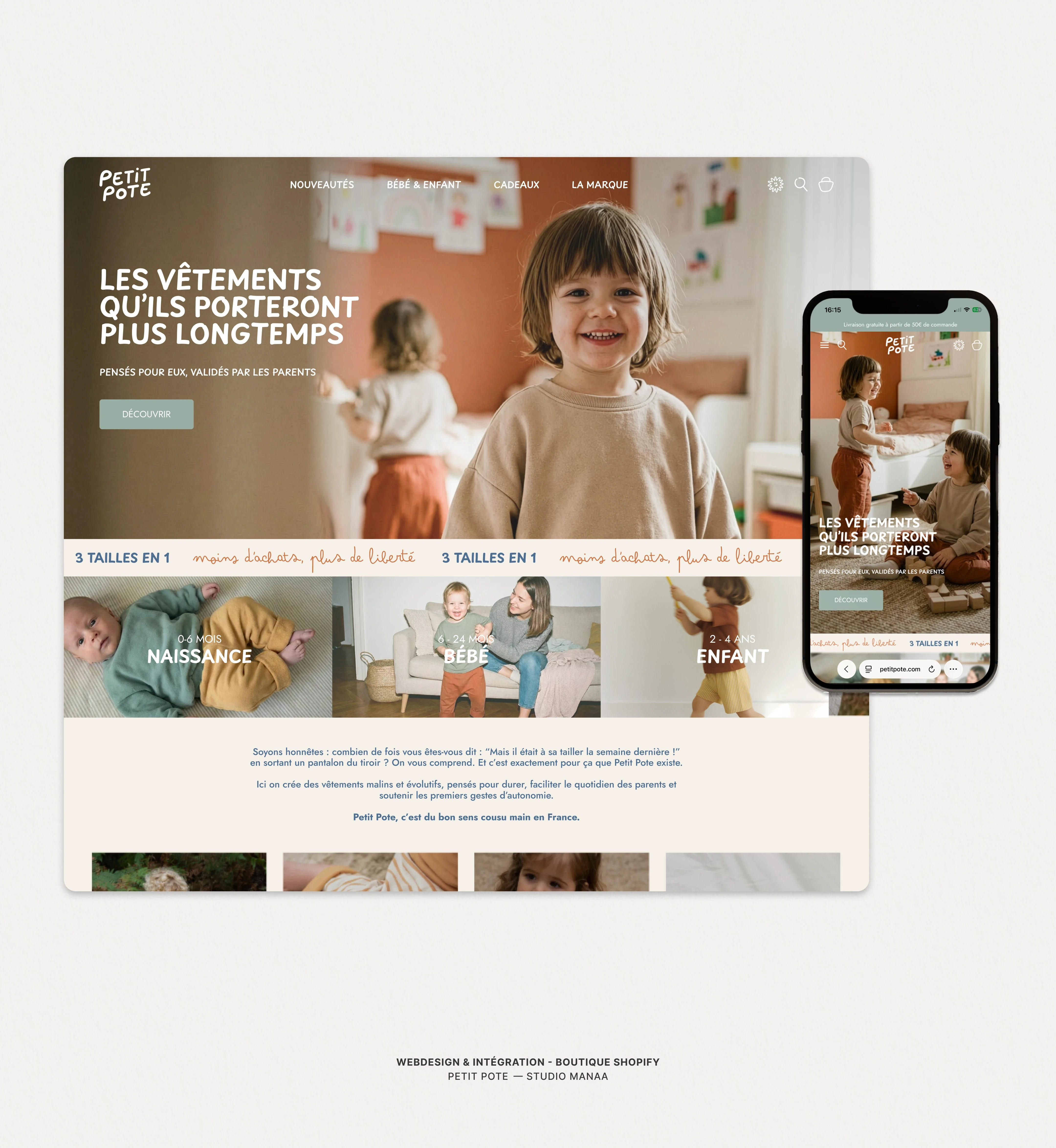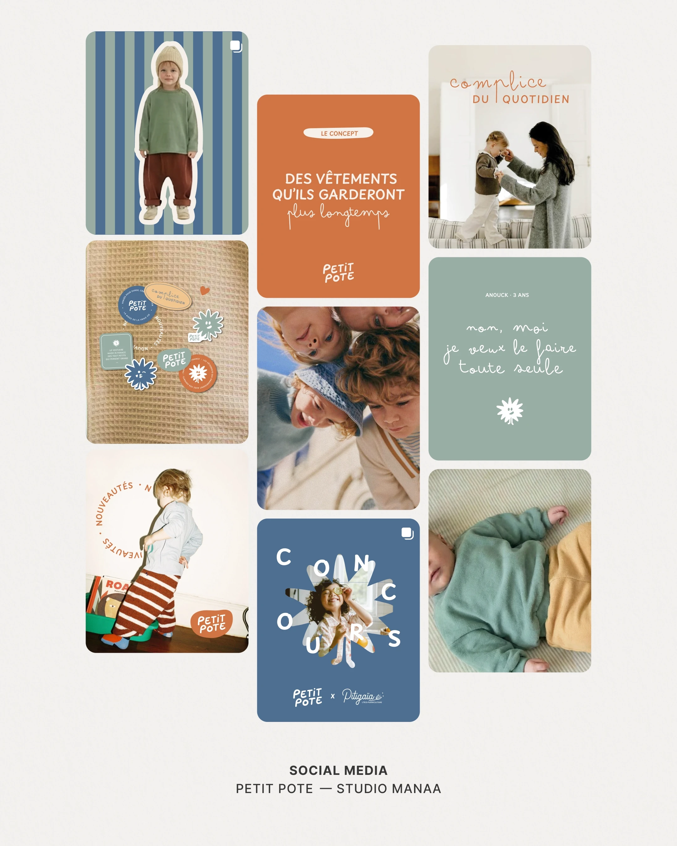 Petit Pote avait un vrai produit. Une vraie conviction. Mais le positionnement et l’univers visuel ne traduisaient ni la vision d’Eloïse, ni la qualité réelle des pièces. Le défi : rétablir une cohérence globale. Comprendre les besoins réels des parents et les réalités du marché pour repositionner la marque sur un territoire plus juste. Créer une identité complète, capable d’incarner cette vision du vestiaire comme allié du quotidien. Puis reconstruire la boutique e-commerce pour offrir une expérience d’achat simple, fluide et pleinement alignée.